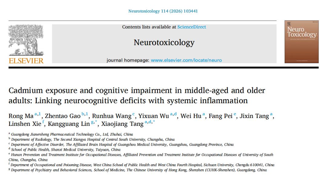 2026年4月7日,广东健尔圣医药科技有限公司唐小江博士团队再次在国际神经毒理学权威期刊《Neurotoxicology》发表重磅论文《Cadmium Exposure and Cognitive Impairment in Middle-Aged and Older Adults: Linking Neurocognitive Deficits with Systemic Inflammation》,揭示镉暴露可能与老年痴呆等认知衰退有关。这是该团队3月25日在同一期刊发表全球首个“镉暴露致脑灰质萎缩的影像学证据”,以及4月1日在国际药学顶刊《Clinical Pharmacology & Therapeutics》发表全球首创化学一类新药“GMDTC治疗镉中毒I期临床试验报告”后,两周内发表的第3篇镉研究国际期刊论文,健尔圣已然成为引领国际重金属中毒防治研发的火车头。