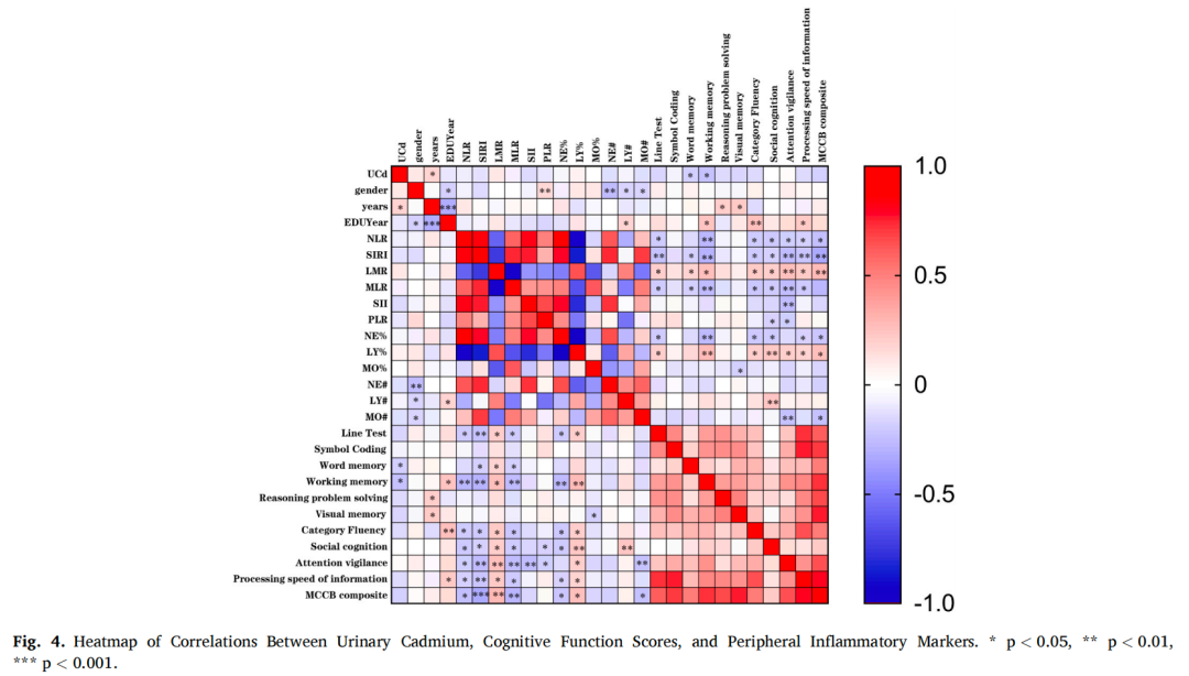 镉是全球广泛分布的强神经毒物,属于Ⅰ类致癌物。工业排放、烟草烟雾及受污染的农作物(如大米、蔬菜、中草药)均可成为其进入人体的途径。既往研究发现,镉与阿尔茨海默(老年痴呆)、帕金森病、儿童自闭症等多种神经疾病可能存在相关性。然而,镉如何具体影响中老年人的认知功能,长期缺乏系统的人群证据。本研究共纳入132名中老年人,通过尿液镉含量检测(ICP-MS)、严谨的神经认知评估(MCCB成套测验) 及多维度炎症标志物分析,首次在中国人群中得出了清晰、可量化的结论。