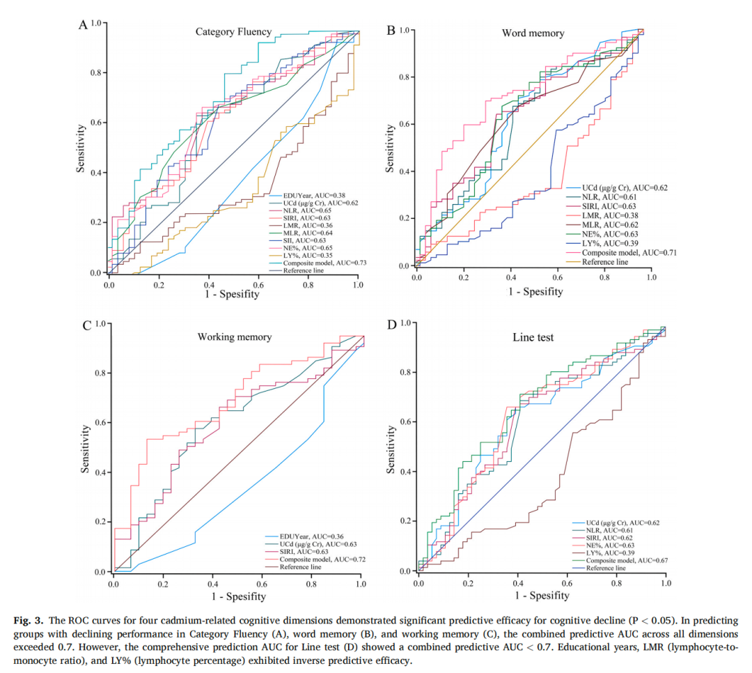 与低镉暴露人群相比,高镉暴露人群在工作记忆、词语记忆、问题处理与解决、视觉记忆四个核心维度及整体认知能力上均显著下降,且尿镉水平越高,词语记忆越差。令人警醒的是,16.7%-21%的镉暴露个体符合轻度认知障碍诊断标准——每5名镉暴露的中老年人中,就有1人处于老年痴呆前驱期。