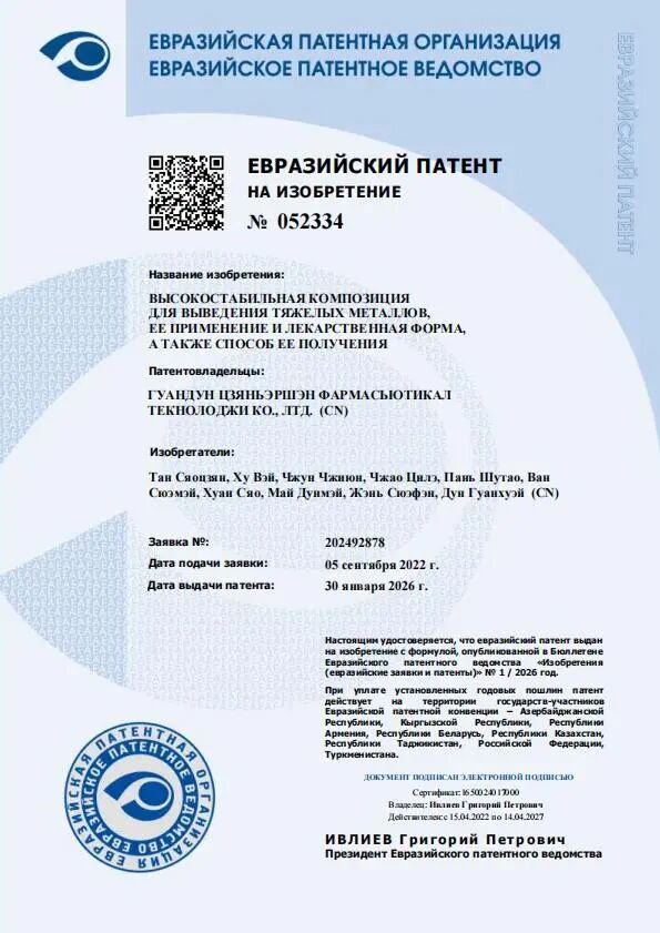 喜报 | 健尔圣重金属驱排药GMDTC叕获欧亚专利组织授权